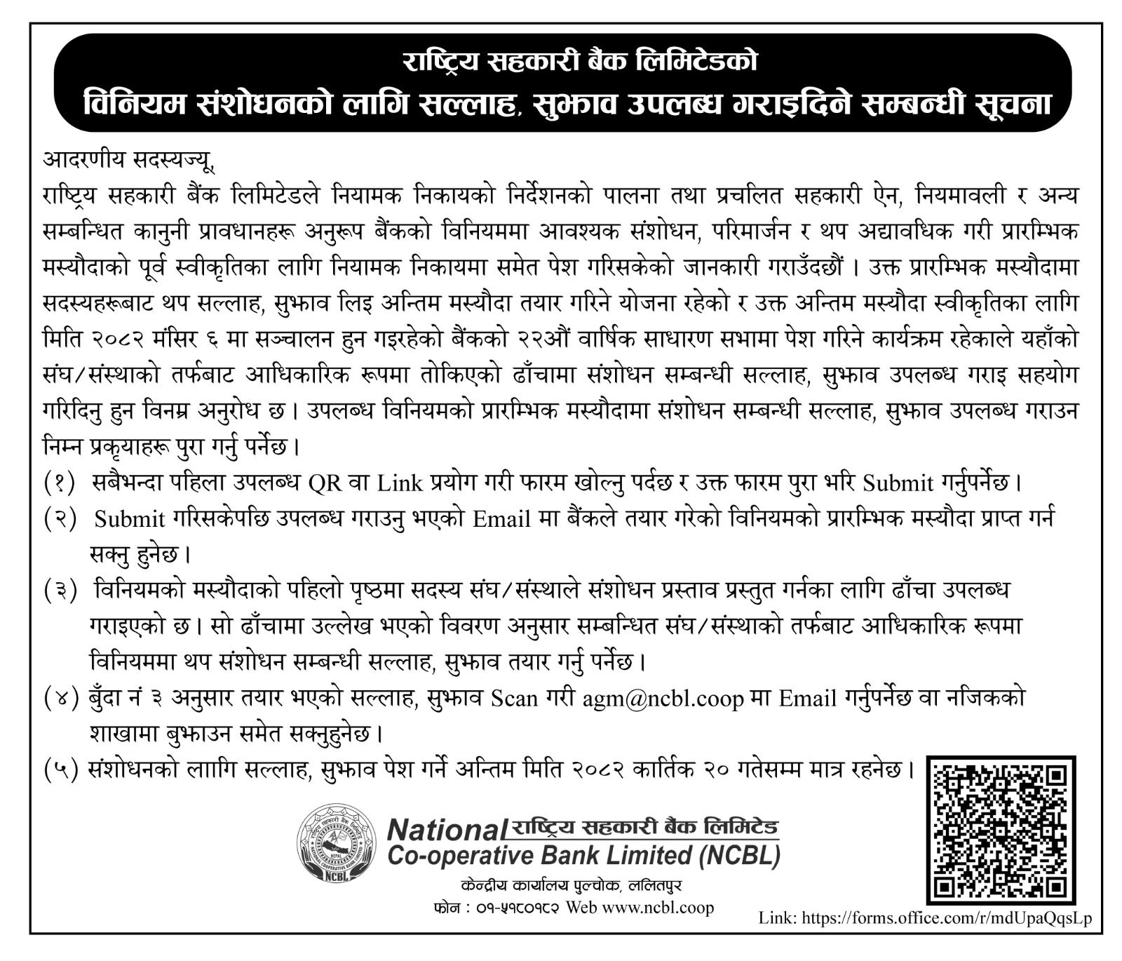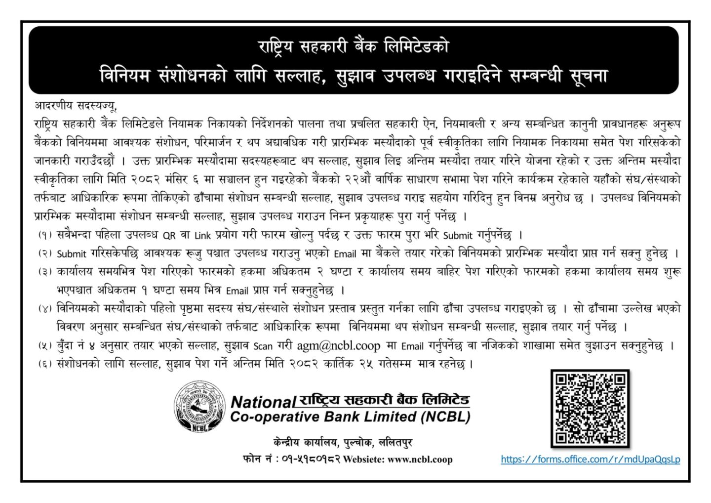 विनियम संशोधनको लागि सल्लाह, सुझाव उपलब्ध गराईदिने सम्बन्धी सूचना