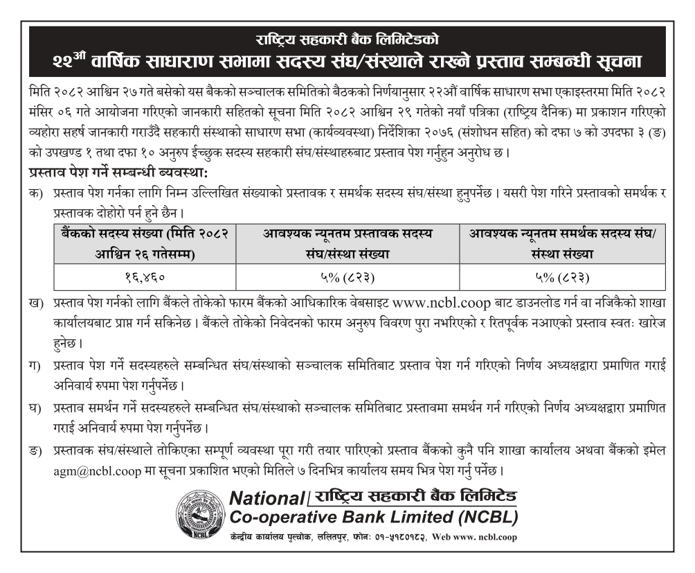 बैंकको २२औं वार्षिक साधारण सभामा सदस्य संघ/संस्थाहरुले राख्ने प्रस्तावको ढाँचा
