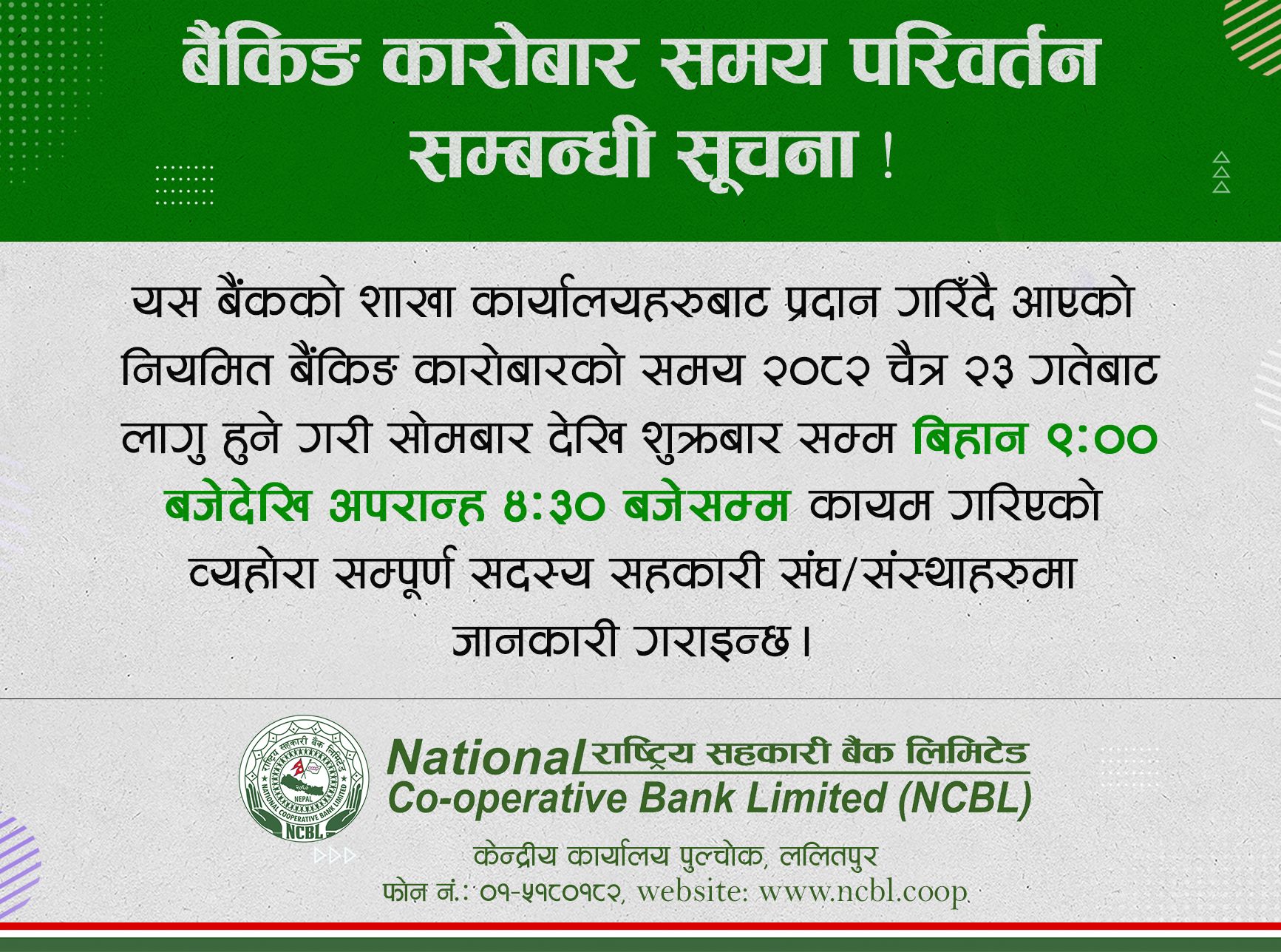 राष्ट्रिय सहकारी बैंक लिमिटेडको २० औं वार्षिक साधारणसभा आगामी मंसिर ३० गते शनिबार हुने भएको छ । बैंकको शुक्रबार सम्पन्न सञ्चालक समिति, लेखा सुपरीवेक्षण समिति, प्रवुद्ध समुह र केन्द्रीय उपसमितिका सदस्यहरुको संयुक्त वैठकले मंसिर ३० गते साधारणसभा गर्ने निर्णय गरेको हो । बैंकको २० औं वार्षिक साधारणसभा अन्तरगत मंसिर ३० गते ७ प्रदेशमा इकाईसभा र पुस ६ गते इकाई प्रतिनिधिहरुको सभा गरिने बैंकका अध्यक्ष के.बी.उप्रेतीले जानकारी दिनुभयो ।